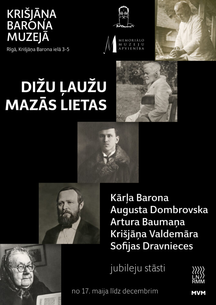 Krišjāņa Barona muzejā (Rīgā, Krišjāņa Barona ielā 3-5) no 17. maija līdz decembrim skatāma izstāde “Dižu ļaužu mazās lietas”, kas veltīta ievērojamām kultūras personībām, kam šogad aprit zīmīgas jubilejas.
