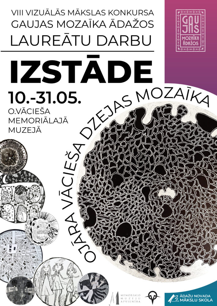 Ādažu novada Mākslu skola aicina uz 8. Vizuālās mākslas konkursa “Gaujas Mozaīka Ādažos” noslēguma izstādi, kas šogad tapusi īpašā sadarbībā ar Ojāra Vācieša muzeju. Šī gada konkursa tēma bija veltīta izcilā latviešu dzejnieka Ojāra Vācieša daiļradei. Bērni un jaunieši, iedvesmojoties no trim īpaši izvēlētiem dzejoļiem, radīja vizuālās mākslas darbus.
