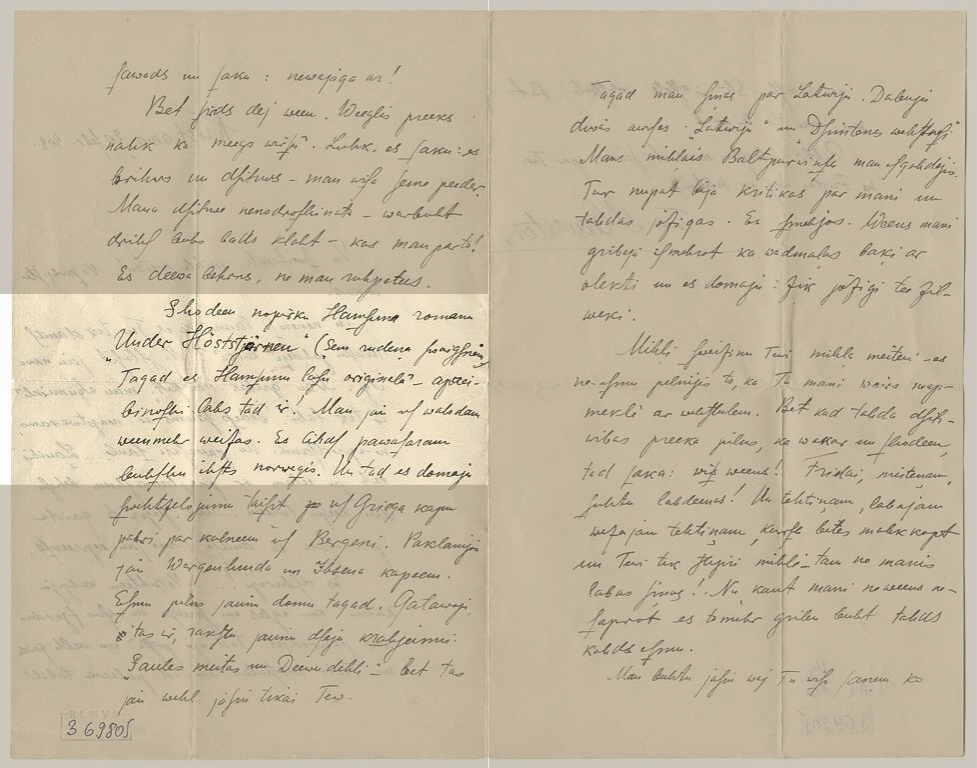 Tu manu drostaliņ, redz, kur Tu saspēries šoreiz, net Verteru izlasīji, pie Hamleta pieķēries, pie Reibericm, Serebrjano izlasīji! Ko Tu īsti no Vertera izlasīji, ko domā par viņu? Vai Tu jau dažu saprati, vai smieties ne reizes nesmējies, cik tie ļaudis ērmoti mīļojas? (..) Ja gribi Šekspīru, jem Līru, Otello, Cēzaru, visas tās karaļu lugas, tās ir tā paša vēsture, tik jaukā veidā, tas ir net pus kronikas. No krieviem pēc Serebrjana Godunovs jālasa, Tarass, “Mertvije duši”, pēc dažs Turgeņeva, Gončarova, līdz Tolstojam. Bet ko niekus tāļāk skaitīt, tagad mums ne lasīšanas laiks, jāsēd, galva jālauza, bet vasarā tad spēlēsim, lasīsim (al.dancosim) cauru dienu (al. nakti).